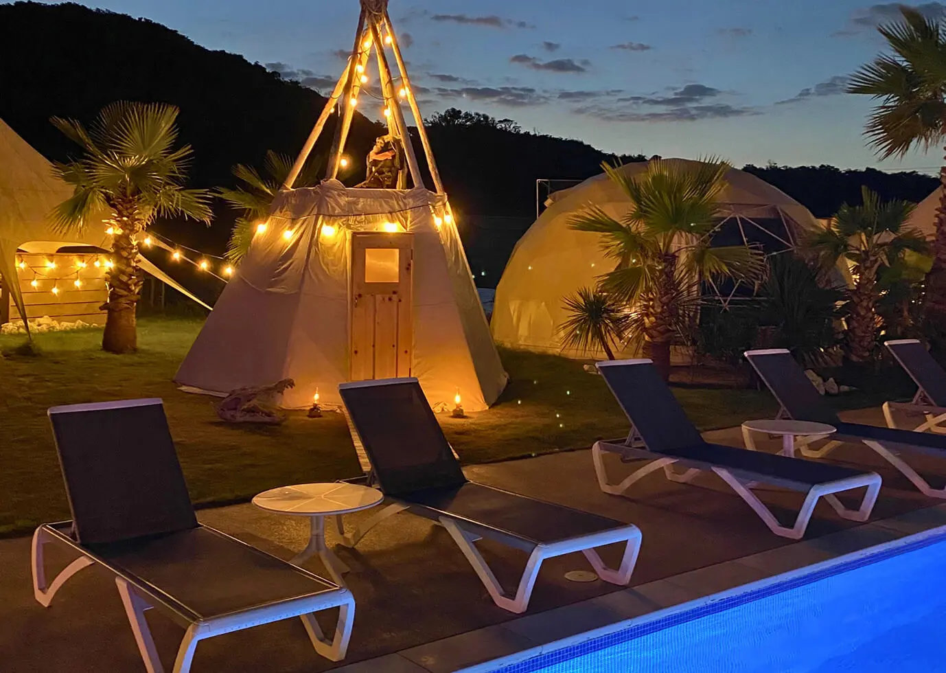 三角テントの個性的なテントの中はヒノキの香りに包まれています。ゲスト専用なので、自由にサウナに入れます。